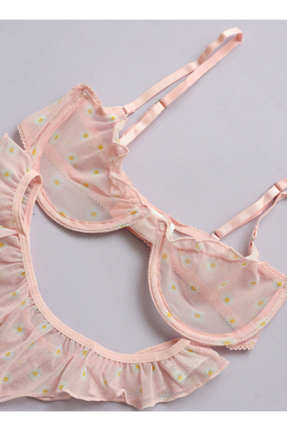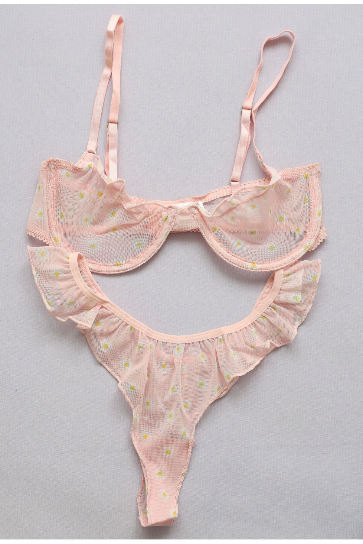 - Zarif tül dokumasıyla öne çıkan pembe çiçek desenleri, her ortamda göz alıcı bir görünüm sunar.; - Fashion Forward tasarımıyla modern ve trend bir stil vurgusu yapar.; - Çiçekli deseniyle feminen detayları ön plana çıkaran bu takım, gardırobunuzdaki vazgeçilmez parçalardan biri olacak.; - Her sezon tercih edebileceğiniz bu takım, mevsim sınırlaması olmadan şıklığınızı korumanızı sağlar.; - Balen detaylarıyla desteklenen balenli tasarım, konforlu bir kullanım sunarken aynı zamanda estetik bir duruş kazandırır.; - Kolay bakım imkanı sağlayan 30 derecede yıkama talimatına sahip olması pratiklik açısından da avantajlıdır.; - Tanga kalıbı sayesinde rahat hareket etme özgürlüğü tanırken, vücut hatlarınıza mükemmel uyum sağlar.; - Kadın ve kız kullanıcılar için ideal olan bu takım, yetişkin yaş grubuna hitap ederken her yaştan kadının tarzını yansıtır.; - Üretimi Türkiye'de gerçekleştirilen bu iç giyim ürünü, yerel üretim kaynaklarından gelen kaliteyi temsil eder.; - Dokuma kumaşı sayesinde dayanıklılık ve yumuşaklık hissi verir; uzun süreli kullanım için uygundur.; - Hem gündüz hem de gece kombinlerinizde rahatlıkla tercih edebileceğiniz çok yönlülükteki tasarıma sahiptir.; - Desenli yapısıyla dikkat çekici bir görünüm sergileyerek kişisel zevkinizi yansıtmanız için idealdir.; - Tanga alt silueti ile minimalizmi benimseyenler için zarif bir seçenektir; görsel olarak minimal ama etkili bir stil oluşturur.; - Tamamen tül materyalden üretilmiş olması hafifliği ve nefes alabilirliği arttırarak gün boyu konfor sağlar.; - İç giyim koleksiyonunuzda yerini alacak bu parça ile kendinizi özel hissedeceksiniz.